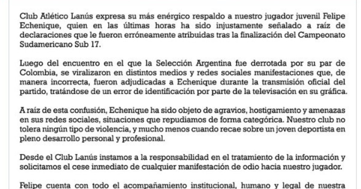 El comunicado de Lanús para apoyar a un juvenil de su cantera por ciberbullying después del Sudamericano Sub 17